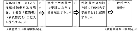 第1条 琉球大学学生表彰規程及び琉球大学学生表彰に関する実施要項に基づき、教育学部から被表彰者を推薦する場合は、以下に定めるところによる。